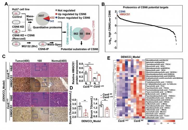 研究团队采用大数据进行联合肝癌组织微阵列免疫组化分析,发现CSN6在肿瘤组织中表达上调且与病人生存率低显著相关。进一步,采用CRISPR-Cas9基因编辑系统构建肝脏特异性CSN6基因敲除小鼠。通过构建原位肝癌自发模型,研究团队发现肝脏特异性敲除CSN6可抑制肝脏肿瘤生长,并降低小鼠血液胆固醇水平,这提示CSN6在肝癌发生发展中发挥重要作用。