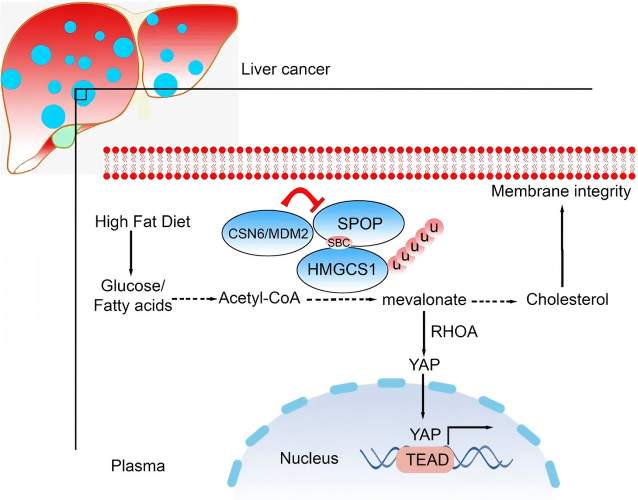 为了阐明CSN6在肝癌中的作用机制,研究团队通过免疫共沉淀质谱和定量蛋白质组学分析,确定了68个潜在的CSN6直接作用靶点,并发现CSN6直接结合并调控HMGCS1(MVA合成相关途径关键酶,催化乙酰乙酰辅酶A,生成β-羟基-β-甲基戊二酰辅酶A(HMG-CoA))的蛋白质水平。进一步,发现CSN6可以调节MDM2的稳定性,从而破坏E3连接酶SPOP的稳定性,对抗SPOP介导的 HMGCS1的泛素化和降解过程。因此,CSN6调控HMGCS1蛋白的稳定性,进而促进MVA途径和YAP1的转录激活,从而促进肿瘤的恶性进展。本研究第一次鉴定两个知名E3连接酶MDM2和SPOP之间存在相互调控,发现MDM2为知名抑癌基因SPOP的E3连接酶,提示SPOP除了在肿瘤突变之外,其低表达也是诱发肿瘤的重要因素之一。