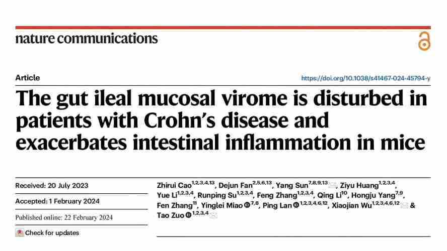 近期,我院左涛研究员作为通讯作者在Nature communications(IF=16.6)上发表题为:“The gut ileal mucosal virome is disturbed in patients with Crohn’s disease and exacerbates intestinal inflammation in mice”的研究论文,揭示了克罗恩患者存在小肠粘膜噬菌体群物种结构和功能的紊乱,以及粘膜噬菌体-细菌微生态网络的失调,并发现克罗恩病患者小肠粘膜噬菌体能够通过重塑肠道细菌群和影响噬菌体-细菌微生态网络,激活宿主肠道粘膜抗微生物相关通路,在炎症性肠病中产生致病作用。这些发现强调了粘膜噬菌体组在克罗恩病发病机制中的重要性,以及粘膜噬菌体组恢复在克罗恩病治疗中的重要性。