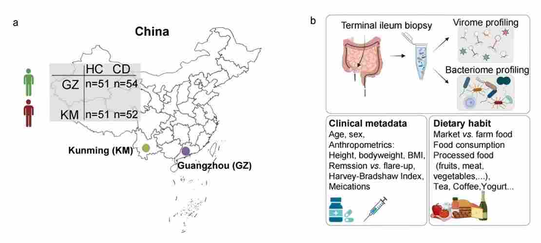 克罗恩病是一种以慢性炎症反复发作为特征的炎症性肠病亚型,与外源宿主因素(人口地理、饮食、药物和生活方式)和宿主生理病理因素(病程和表型)有着复杂的联系。虽然克罗恩病的确切原因尚不清楚,但肠道微生物群的紊乱已被证明与克罗恩病的发生发展息息相关。除细菌之外,肠道中还存在着大量的噬菌体,调控着肠道细菌群的结构与代谢,同时参与了肠道粘膜免疫稳态的维持。
