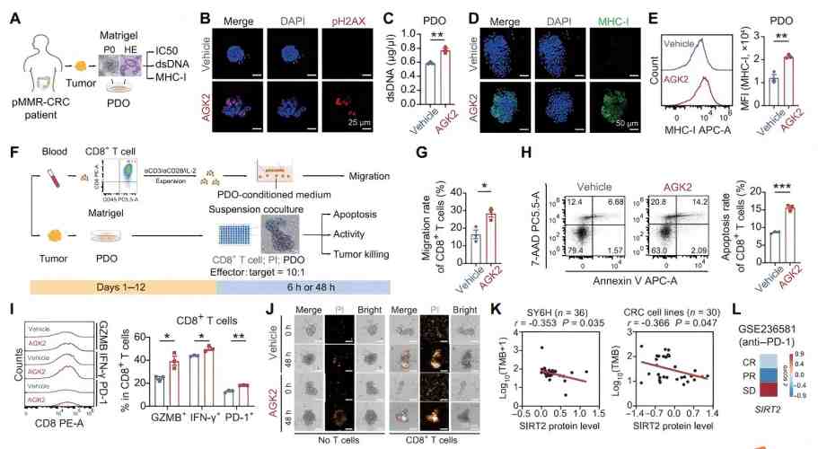 研究团队通过多组学大数据分析发现SIRT2是CRC免疫逃逸的关键分子。无论是基因敲低还是药理学抑制SIRT2,均可增强细胞毒性 CD8⁺ T细胞的浸润和杀伤效应,从而诱导肿瘤消退。进一步的体外实验分析表明,SIRT2可与MMR蛋白MLH1相互作用并对其去乙酰化,从而防止MLH1泛素化和降解。SIRT2的敲低或抑制会下调MLH1表达,增加DNA损伤,并激活cGAS-STING先天免疫信号通路。此外,体内外实验均显示,抑制SIRT2可促进肿瘤新抗原的生成,并增强MHC-I类分子的抗原呈递,将肿瘤微环境重塑为免疫活跃状态,并诱导持久的免疫记忆。最后,研究团队采用SIRT2抑制剂AGK2联合抗PD-1治疗,显著增强了免疫反应,使肿瘤对免疫治疗更敏感,并在体内模型中实现了明显的肿瘤缩小。